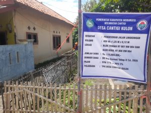Jalan tersebut dibangun diblok tengah RT 007/004 dan blok Kidul RT 008/004, sepanjang 400 meter dengan lebar 1,25 meter dan ketebalan 0,12 meter menggunakan konstruksi Ready Mik, dengan nilai anggaran mencapai Rp115.000.000. Pelaksana TPK Desa Cantigi Kulon.