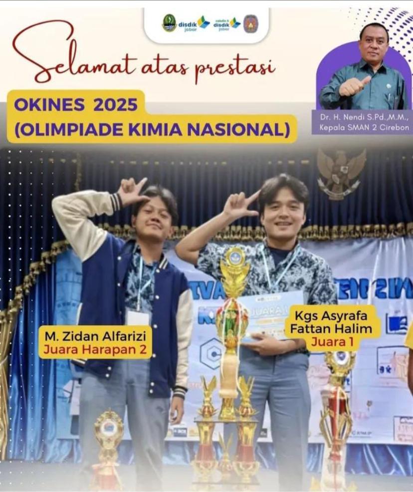 Cirebon | dinamikapendidikan.com – Prestasi membanggakan kembali ditorehkan oleh SMAN 2 Cirebon. Sekolah yang dikenal sarat prestasi ini berhasil meraih Juara 1  Olimpiade Kimia Nasional  (OKINES) 2025, dan juara harapan 2 sebuah ajang bergengsi yang mempertemukan para pelajar berprestasi dari seluruh Indonesia.
