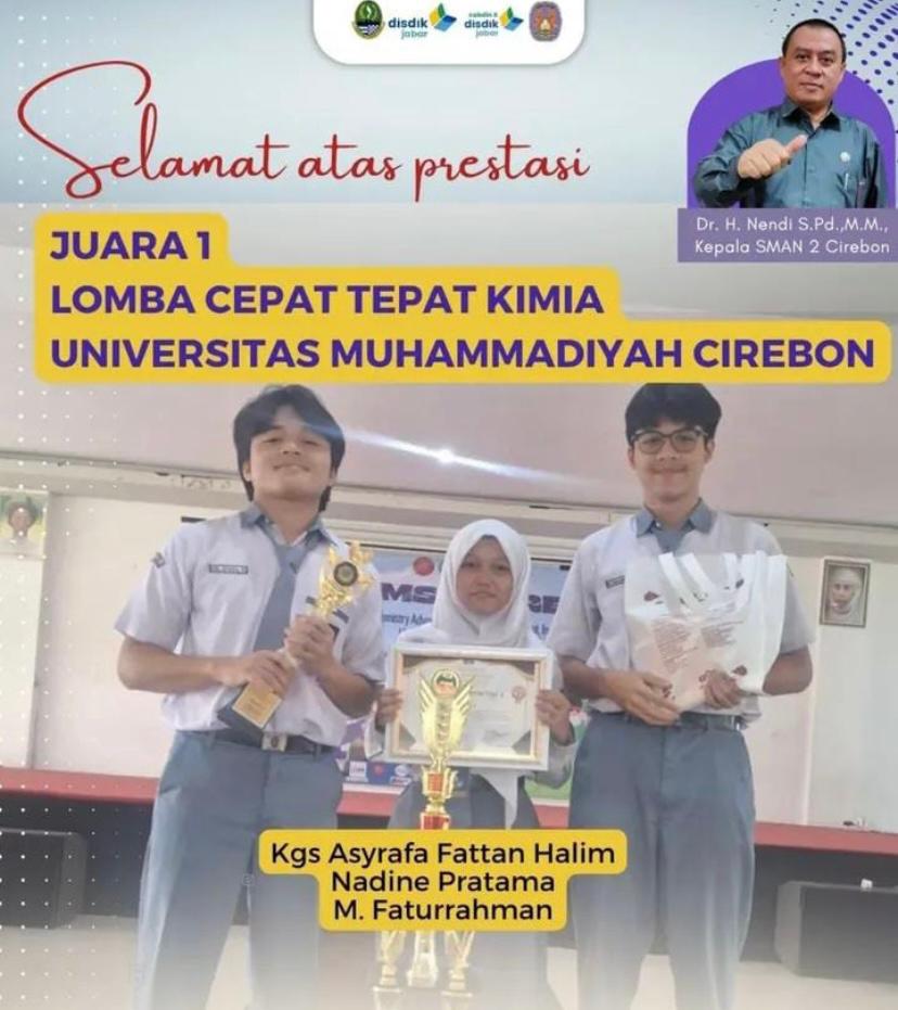 Dalam ajang lomba cepat tepat kimia dan lomba cerdas tangkas kimia di universitas muhammadiyah Cirebon. tim SMAN 2 Cirebon berhasil tampil gemilang dan menyabet juara 1  cepat tempat kimia dan juara 3 cerdas tangkas kimia mengungguli puluhan peserta dari sekolah lain.